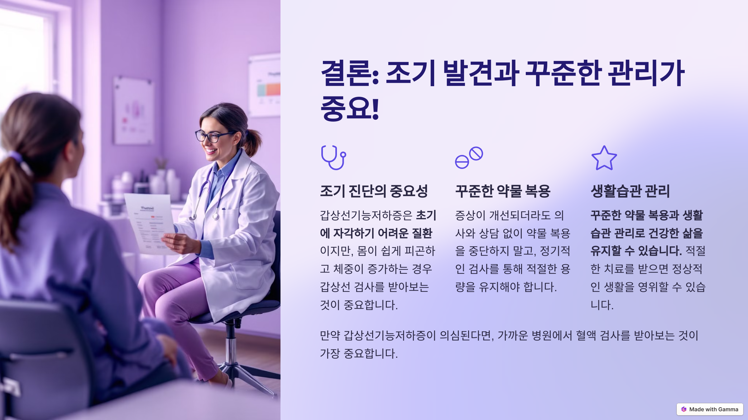 갑상선기능저하증은 약물 치료를 통해 갑상선 호르몬을 보충하는 것이 기본적인 치료법입니다.
