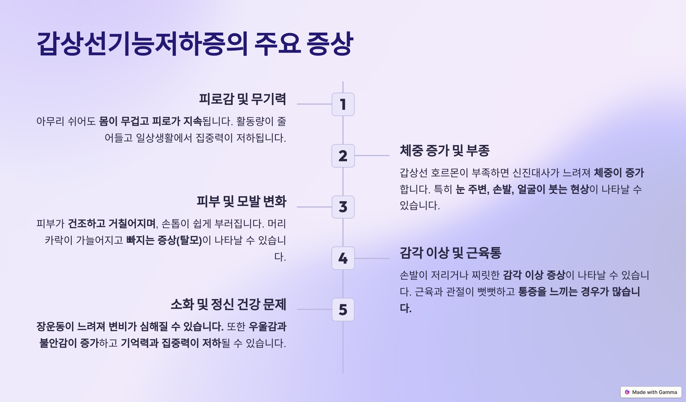 갑상선기능저하증의 증상은 서서히 나타나며, 피로와 체중 증가 같은 일반적인 증상으로 시작됩니다.