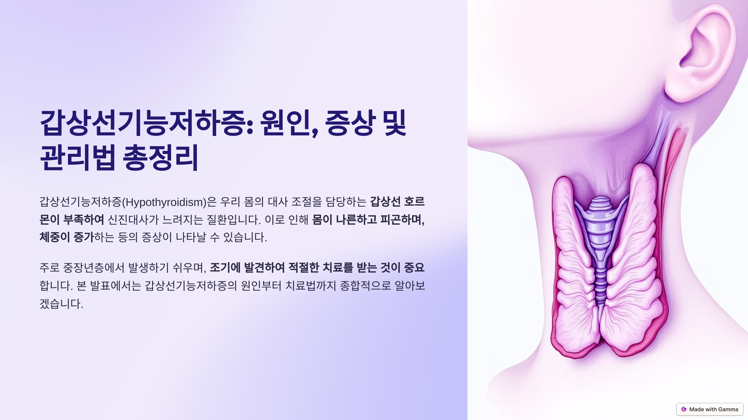 갑상선기능저하증(Hypothyroidism)은 우리 몸의 대사 조절을 담당하는 갑상선 호르몬이 부족하여 신진대사가 느려지는 질환입니다.
