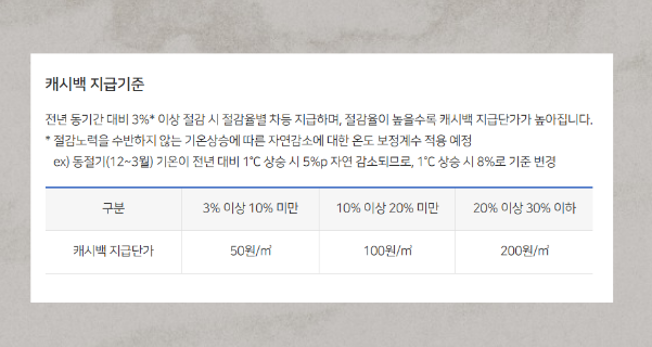 - 지급 대상: 전년도 같은 기간 대비 가스 사용량 3% 이상 절감한 가구